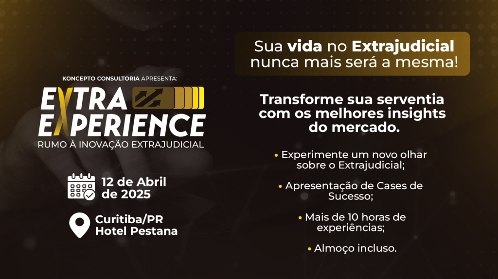 Em 2025, a Koncepto dará um passo importante para transformar a gestão extrajudicial com o evento Extra Experience, que acontecerá no dia 12 de abril, no Hotel Pestana, em Curitiba – PR. Este evento foi criado para proporcionar uma imersão completa nas práticas e tendências mais inovadoras do setor.
